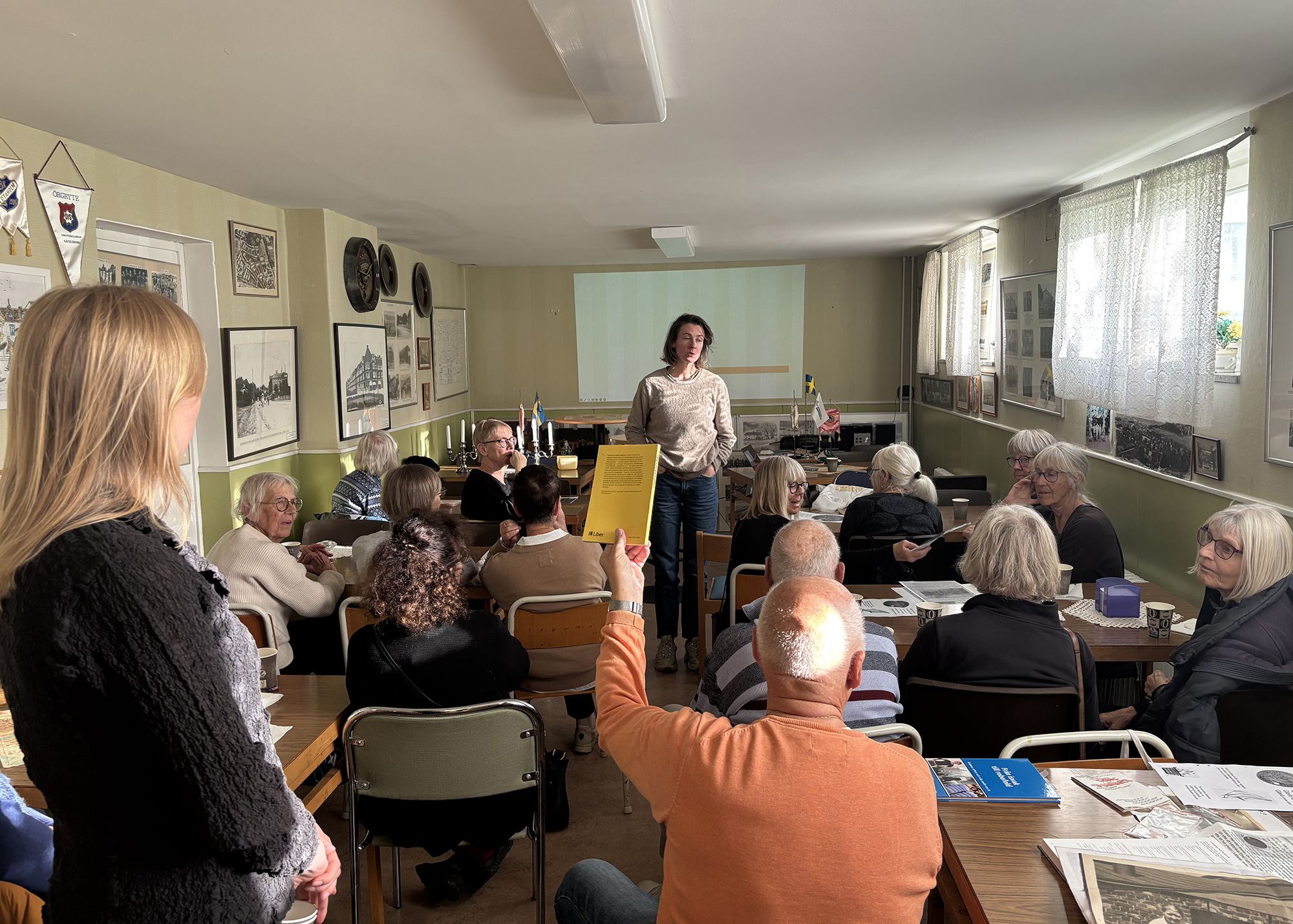 När konstnären Åsa Dybwad Norman skulle berätta om sitt verk Gloria tvättar igen för vår Seniorklubb, bjöds vi in att träffa hembyggdsföreningen Gamla Gamlestadspojkar och att hålla evenemanget i deras lokaler. Det passade bra eftersom Dybwad Normans verk varit en del av Fältstudier, en konstnärlig undersökning av våra nya omgivningar i Gamlestaden.