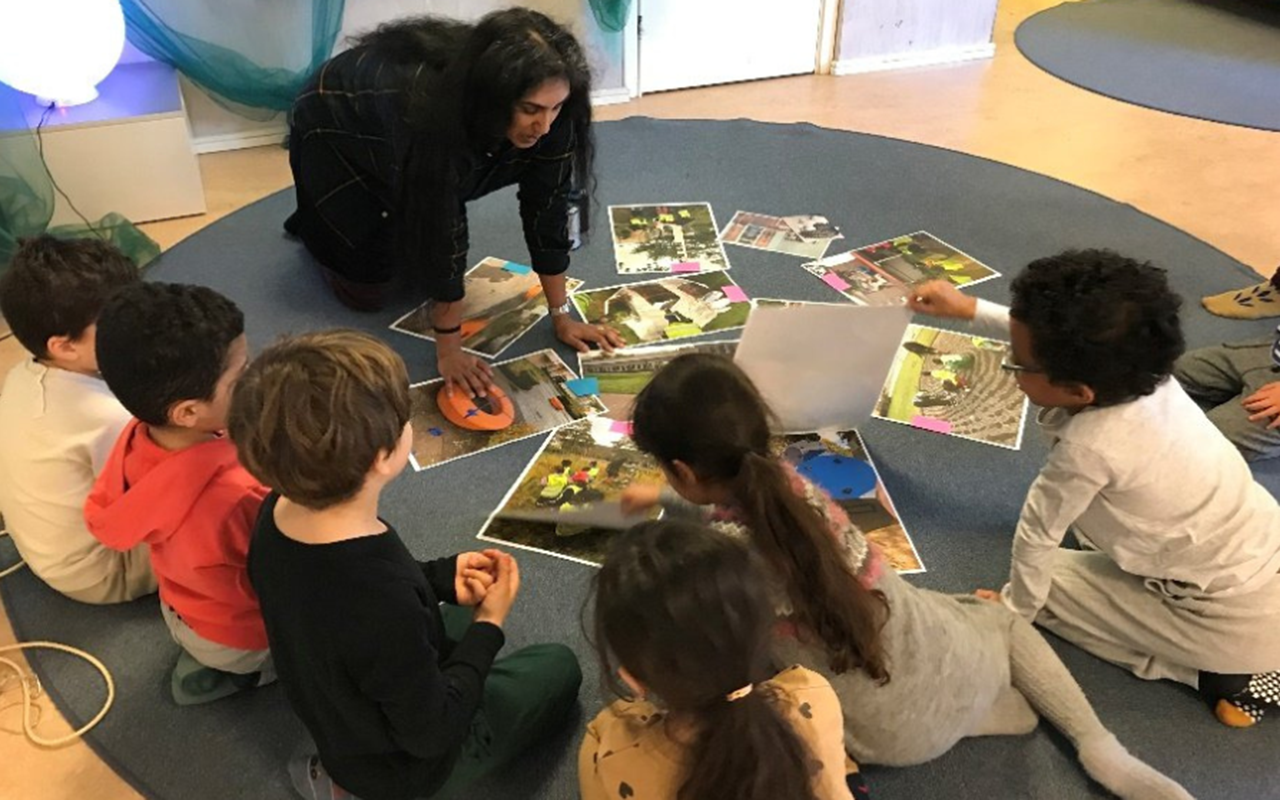 Konstpedagog Subani Melin visar bilder efter konstpromenad med barn från förskolan i Eriksbo.
